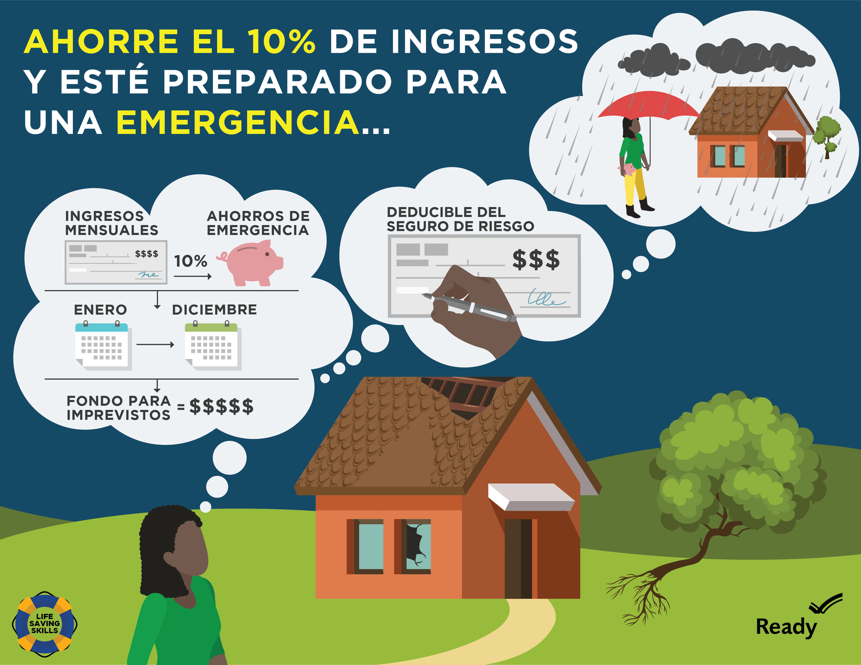 Ilustración de una mujer de pie frente a una casa dañada. Las burbujas de pensamiento la representan pensando en ahorrar dinero para una emergencia, escribir un cheque y luego ser cubierta por un paraguas durante una tormenta junto a la misma casa reparada. Ahorre el 10% de ingresos y este preparado para una emergencia ...