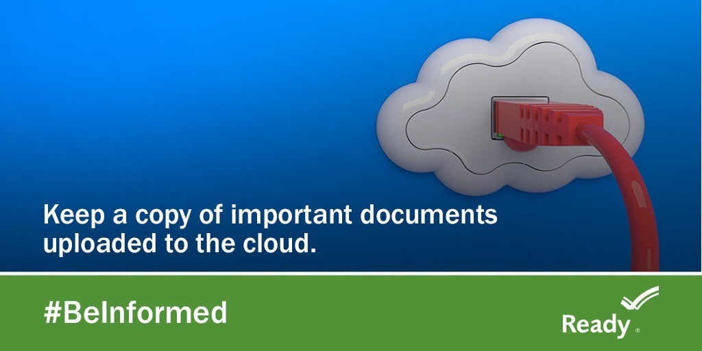 Picture of a red ethernet cord plugged into a cloud shaped plug cover on a blue wall, representing a cloud in the sky. Keep a copy of important documents uploaded to the cloud. #BeInformed