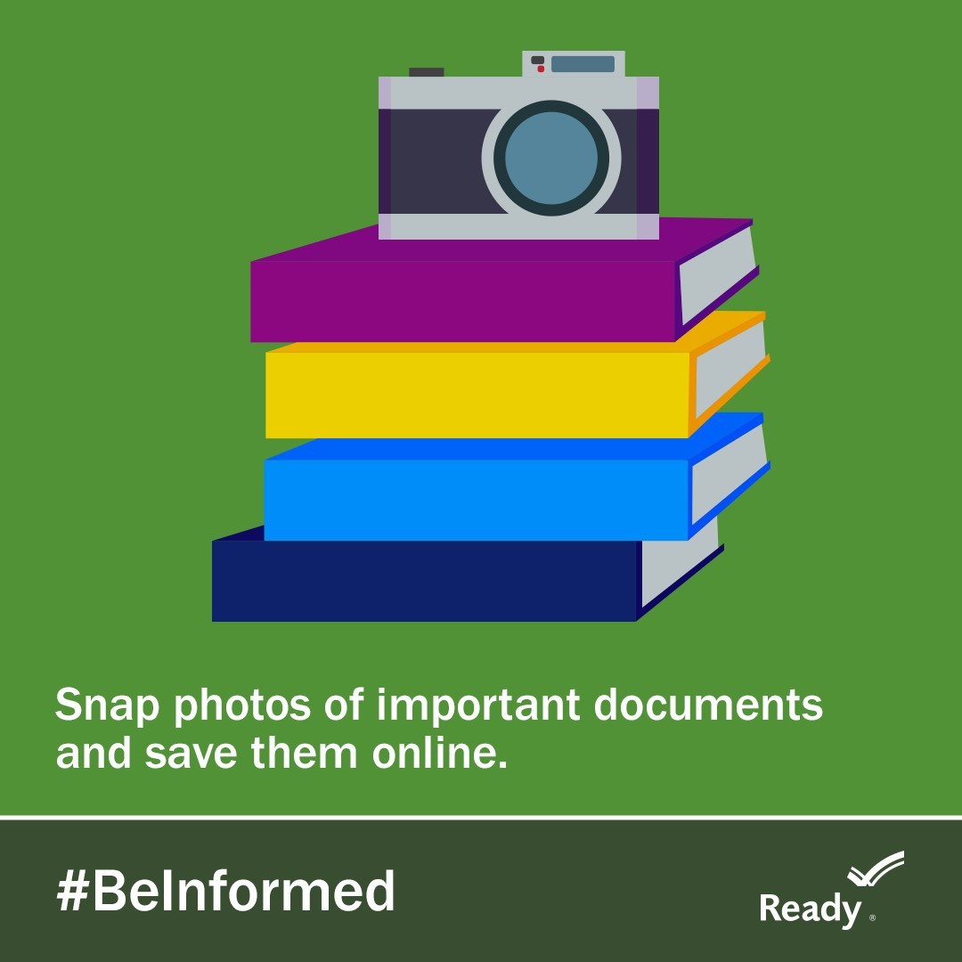 Graphic image of four brightly covered books with a camera sitting on top of the stack, against a green background. Snap photos of important documents and save them online. #BeInformed