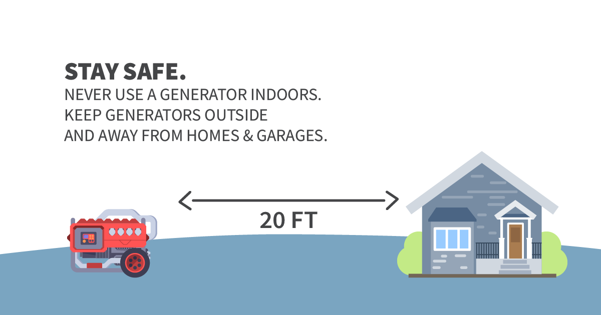 STAY SAFE.  NEVER USE GENERATOR INDOOR KEEP GENERATOR OUTSIDE. AND AWAY FROM HOMES & GARAGES.  20 FT