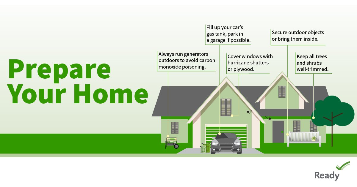 Always run generators outdoors to avoid carbon monoxide poisoning.  Fill up your car’s gas tank, park in a garage if possible.  Cover windows with hurricane shutters of plywood.  Secure outdoors objects or bring them inside. Keep all trees and shrubs well-trimmed.