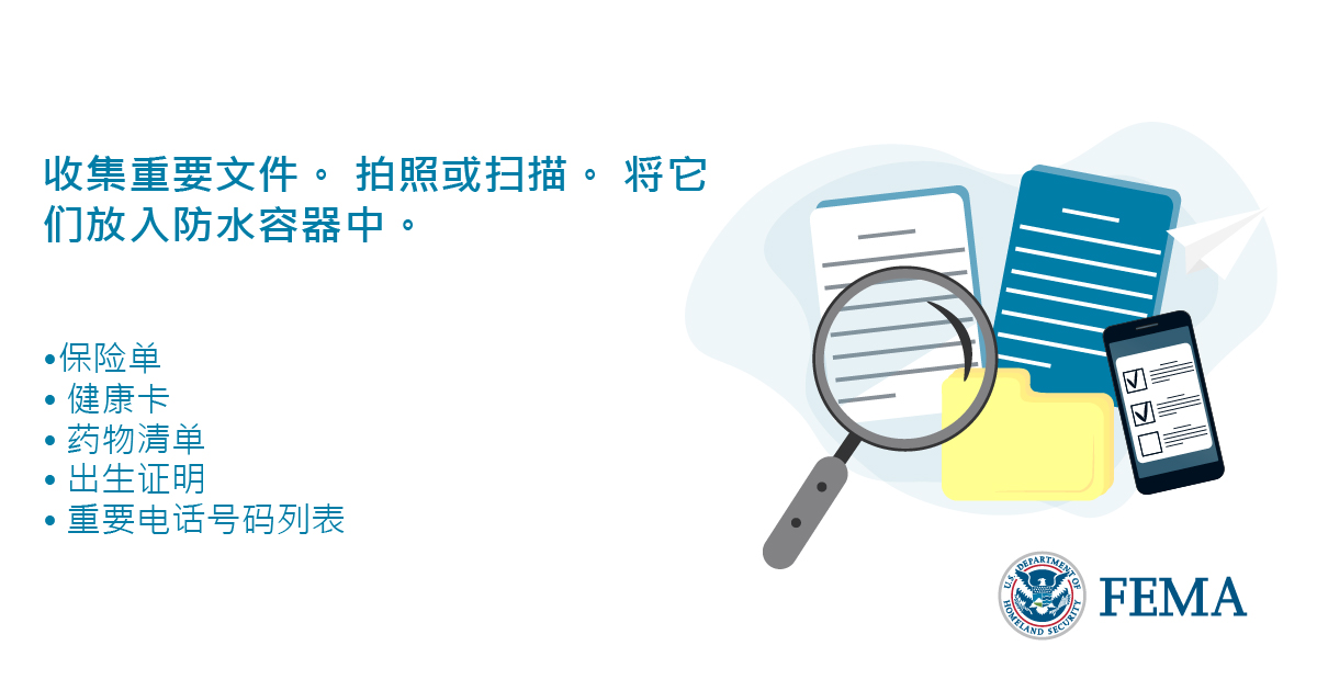 收集重要文件。拍照或扫描。将它们放在防水容器中。 包括保险单、健康卡、药物清单、出生证明和重要电话号码清单。
