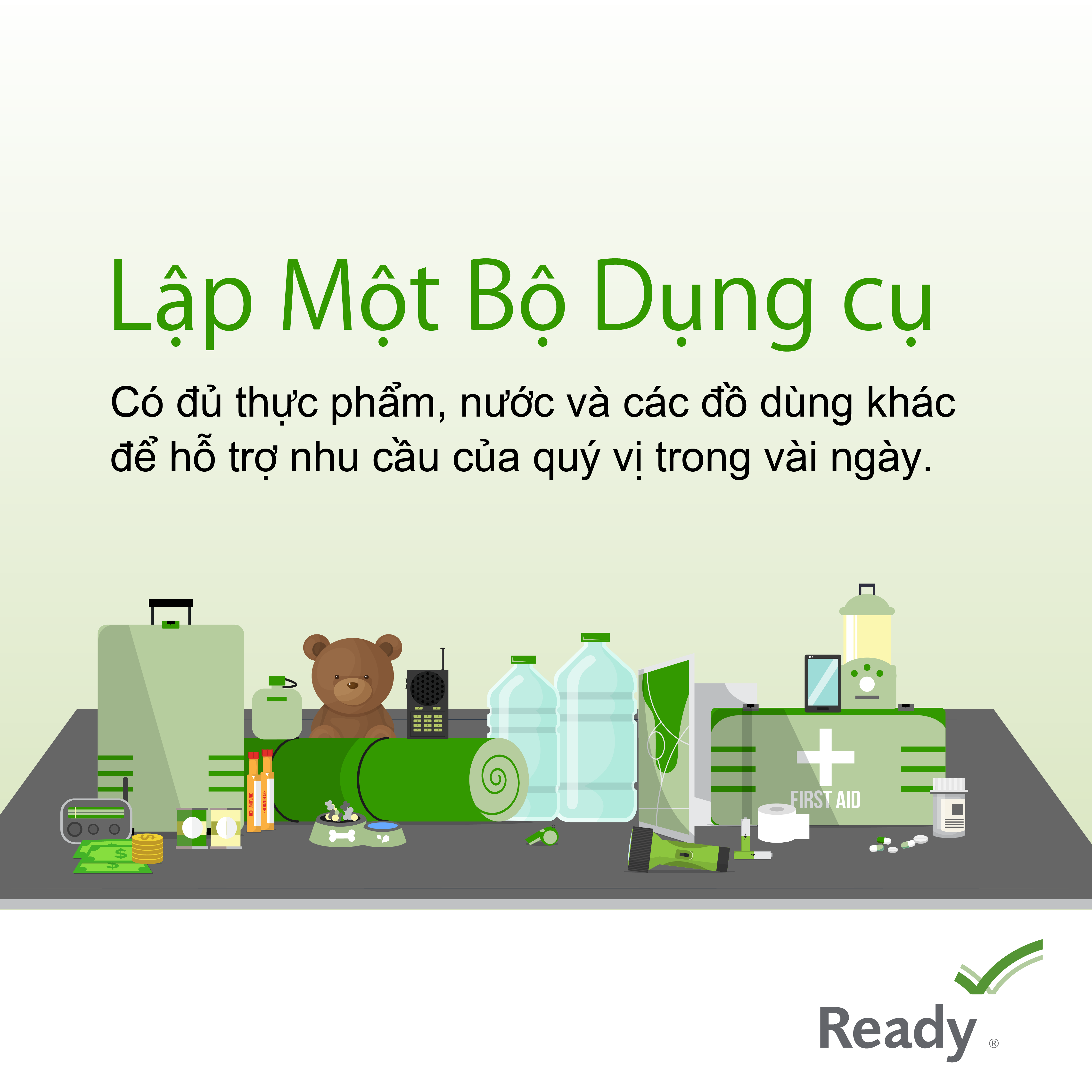 Lập Một Bộ Dụng cụ  Có đủ thực phẩm, nước và các đồ dùng khác để hỗ trợ nhu cầu của quý vị trong vài ngày.