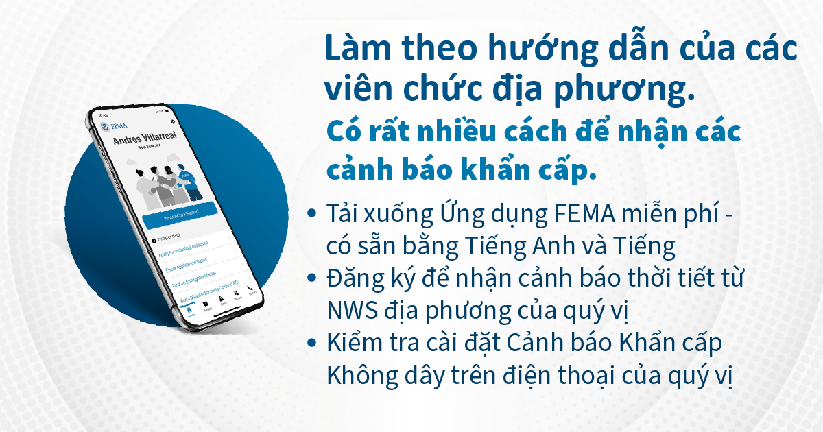 Hãy lắng nghe các quan chức địa phương. Có nhiều cách để nhận thông báo khẩn cấp. Quý vị có thể tải xuống Ứng dụng FEMA miễn phí có sẵn bằng tiếng Anh và tiếng Tây Ban Nha, đăng ký nhận cảnh báo về thời tiết từ văn phòng Dịch vụ Dự báo Thời tiết Quốc gia tại địa phương và kiểm tra cài đặt Cảnh báo Khẩn cấp Không dây trên điện thoại của quý vị.