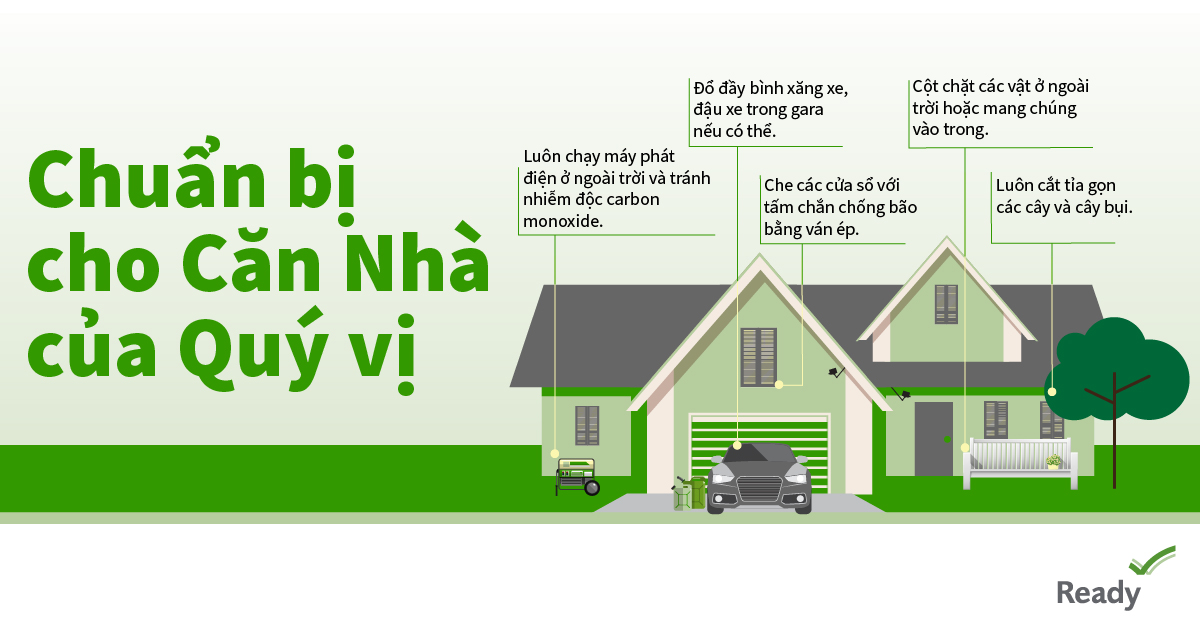 Chuẩn bị cho Căn Nhà của Quý vị  Luôn chạy máy phát điện ở ngoài trời và tránh nhiễm độc carbon monoxide.  Đổ đầy bình xăng xe, đậu xe trong gara nếu có thể.  Che các cửa sổ với tấm chắn chống bão bằng ván ép.  Cột chặt các vật ở ngoài trời hoặc mang chúng vào trong.  Luôn cắt tỉa gọn các cây và cây bụi.