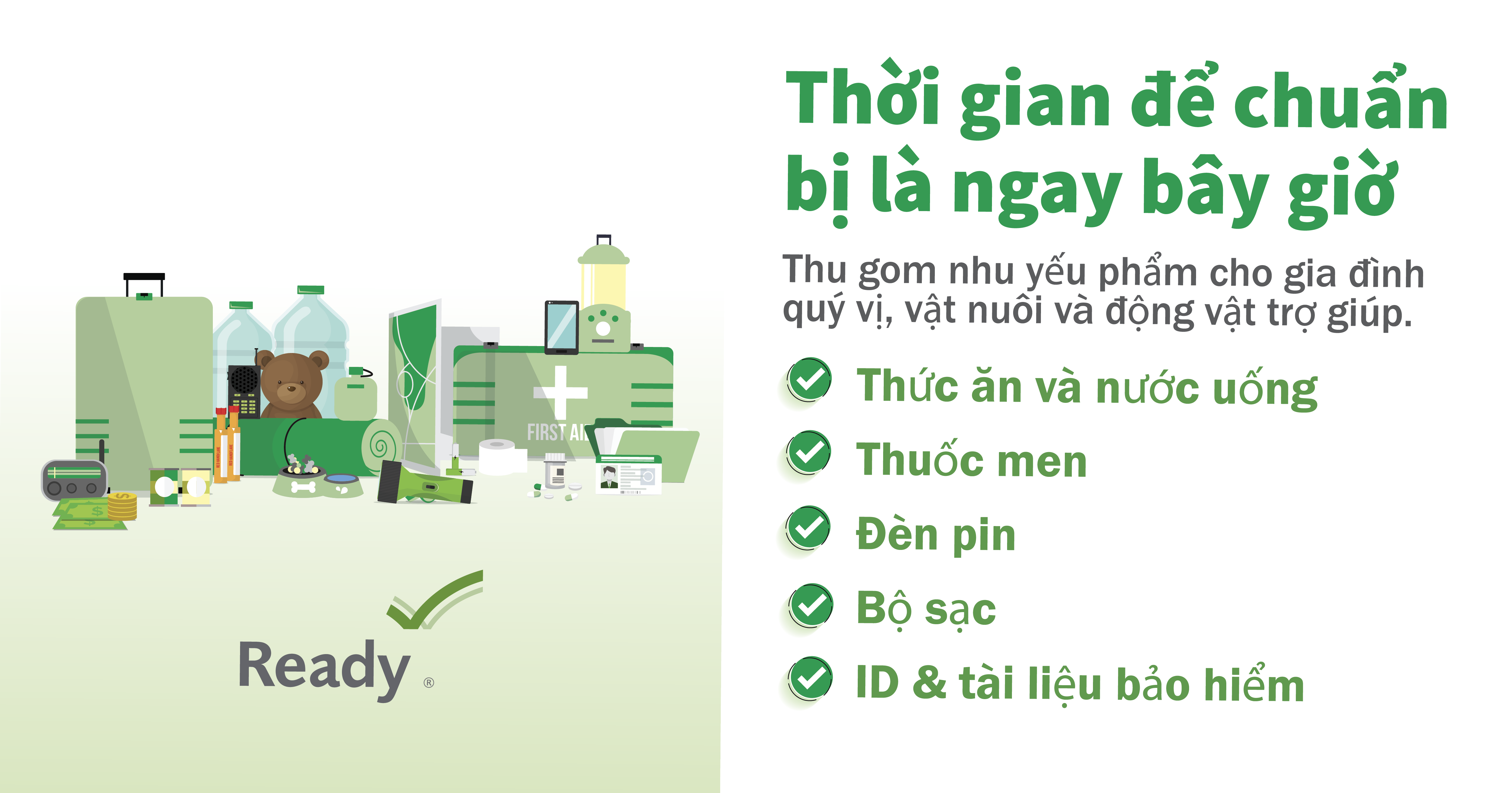 Giờ là Lúc để Chuẩn bị. Thu thập các Vật dụng cho gia đình, vật nuôi và động vật trợ giúp của quý vị. Các vật dụng bao gồm thực phẩm và nước, thuốc, đèn pin, bộ sạc, giấy tờ tủy thân và bảo hiểm.