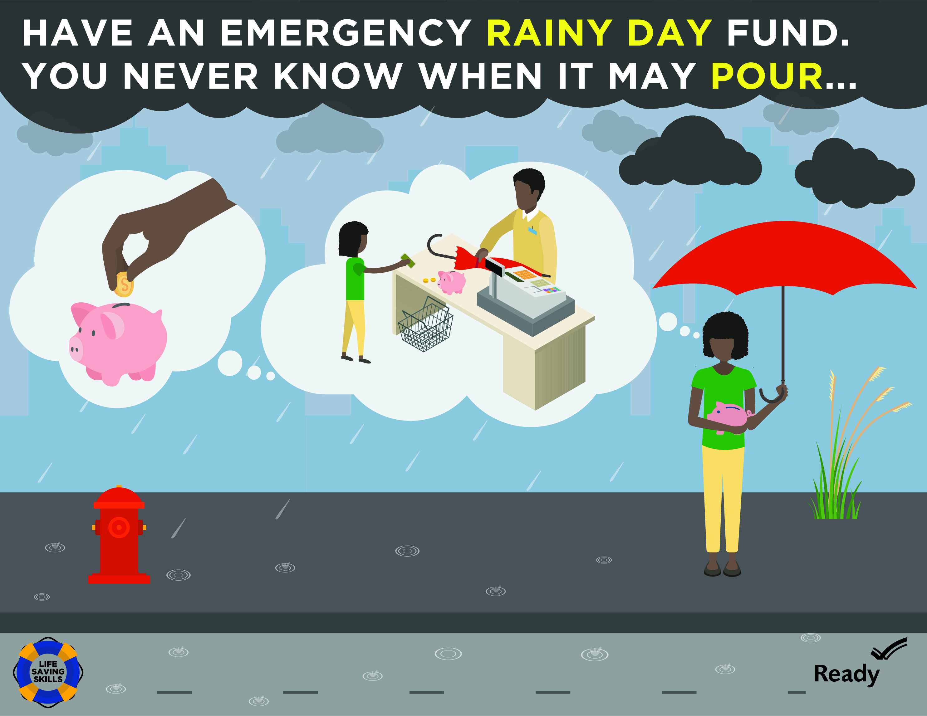 A girl in the rain is holding an umbrella and piggy bank. Her thought bubbles show her putting money in her piggy bank and using the money to buy an umbrella. Have an emergency rainy day fund. You never know when it may pour.