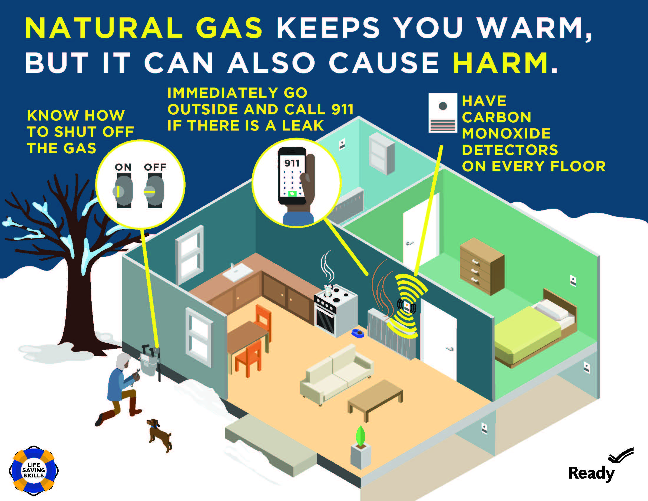 A carbon monoxide detector is sounding an alarm inside of a home. A woman has taken her pet outside to keep it safe. It is snowing outside, but she is taking proper actions after a gas leak. Natural gas keeps you warm, but it can also cause harm. Know how to shut off the gas, immediately go outside and call 911 if there is a leak, and have carbon monoxide detectors on every floor.