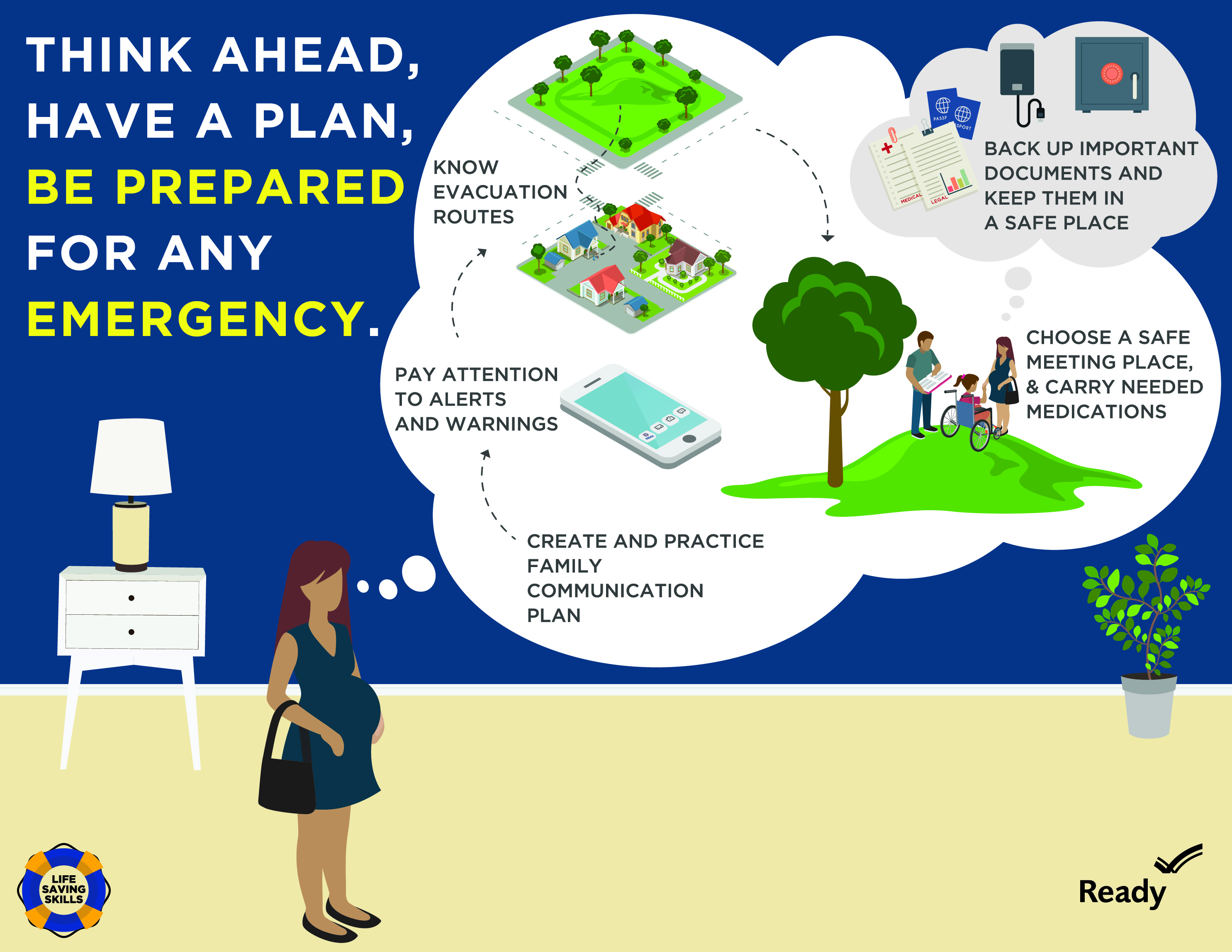A pregnant woman has a thought bubble showing emergency preparedness actions. Think ahead, have a plan, and be prepared for any emergency. Know evacuation routes, pay attention to alerts and warnings, create and practice a family communication plan, back up important documents and keep them in a safe place, and choose a safe meeting place and carry needed medications.
