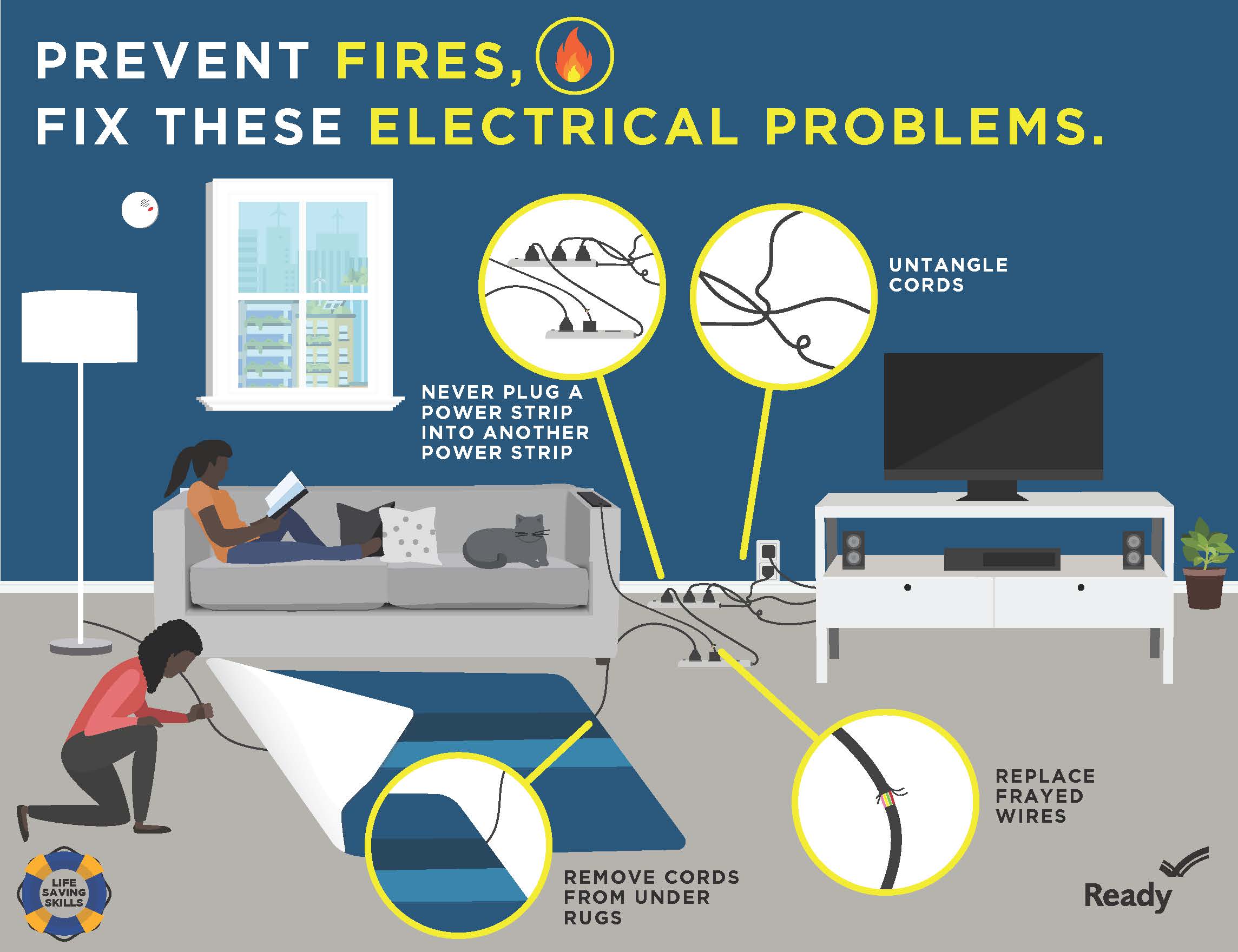 A woman is sitting on the sofa with her cat in the living room. Another woman in the same room is taking actions to prevent fires. Prevent fires, fix these electrical problems. Never plug a power strip into another power strip, untangle cords, remove cords from under rugs, and replace frayed wires.