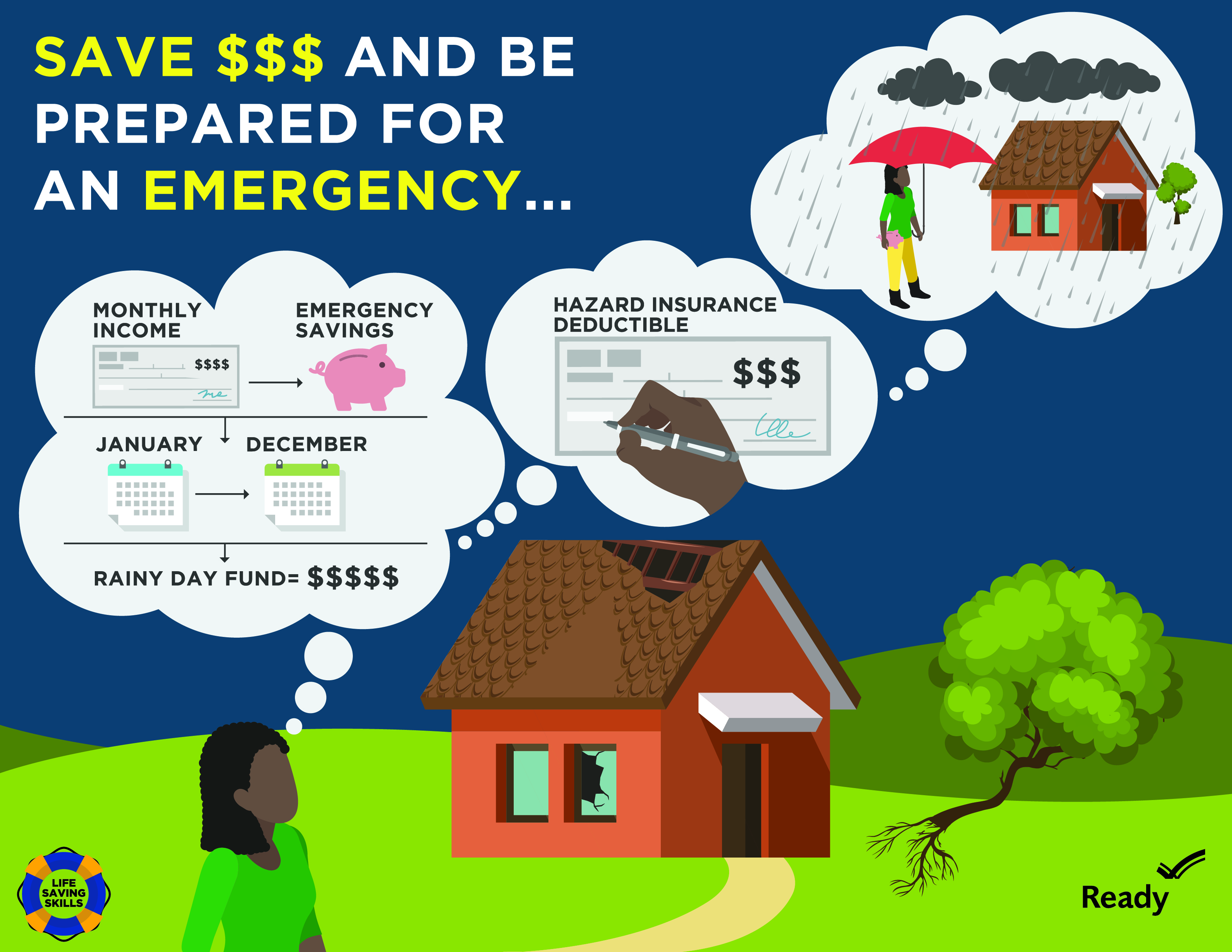 A woman stands outside her damaged home and yard. Her first thought bubble shows some of her monthly income going to an emergency savings from January to December to grow a rainy day fund. The second bubble is her writing a check for her hazard insurance deductible. The third bubble is of her in the rain next to her fixed home and yard. Save money and be prepared for an emergency.