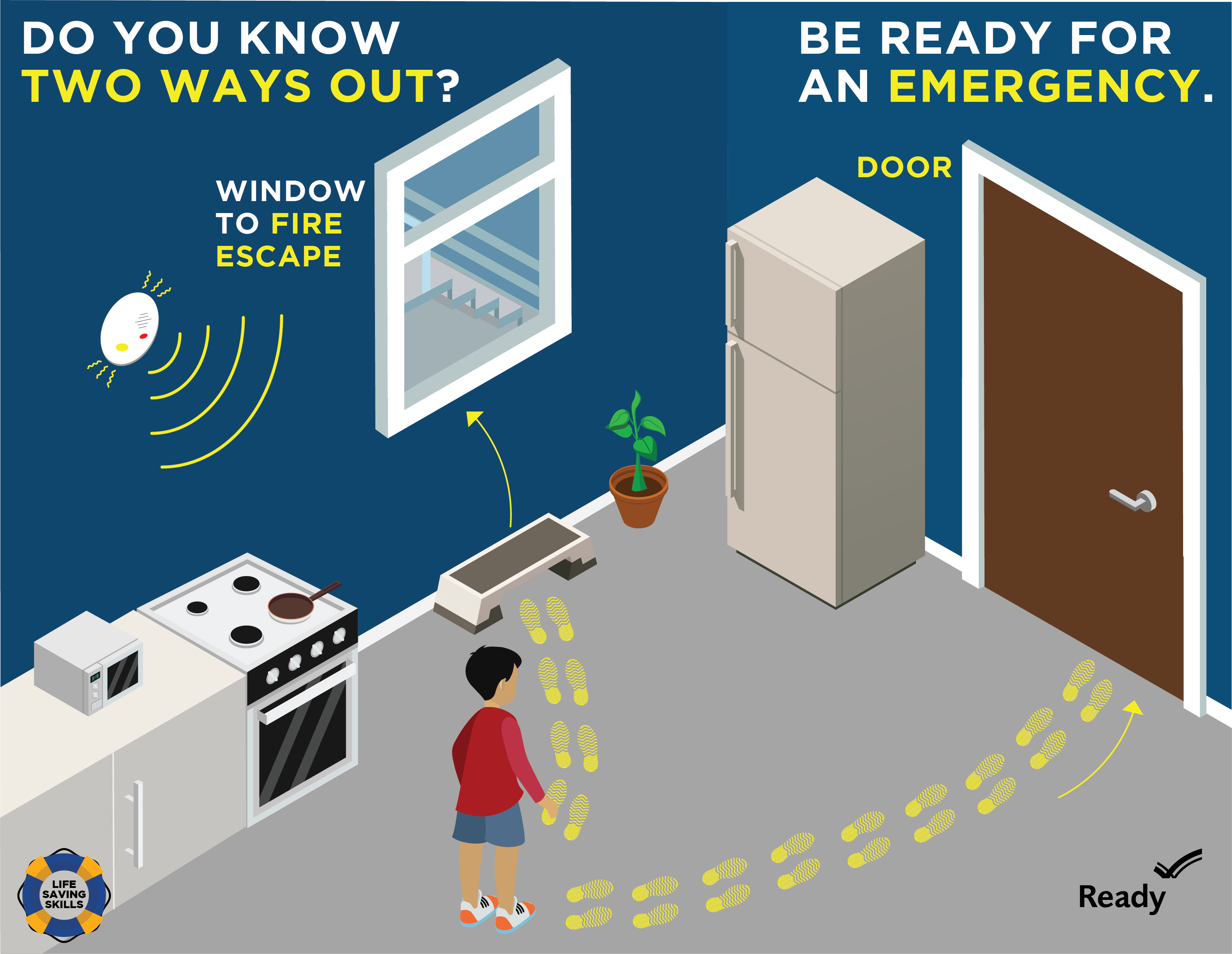 A boy has two ways to exit a kitchen as a fire alarm sounds. Paths lead to a window to a fire escape and a door. Do you know two ways out? Be ready for an emergency.