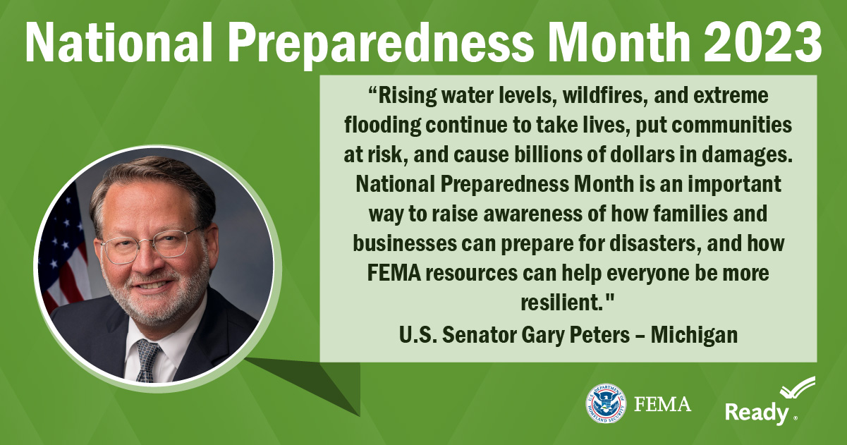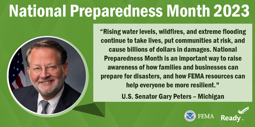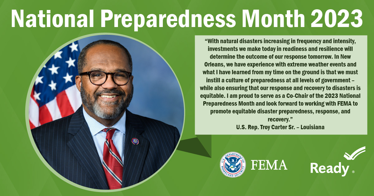 A collection of graphics featuring quotes from the 2023 National Preparedness Month Congressional Co-Chairs.