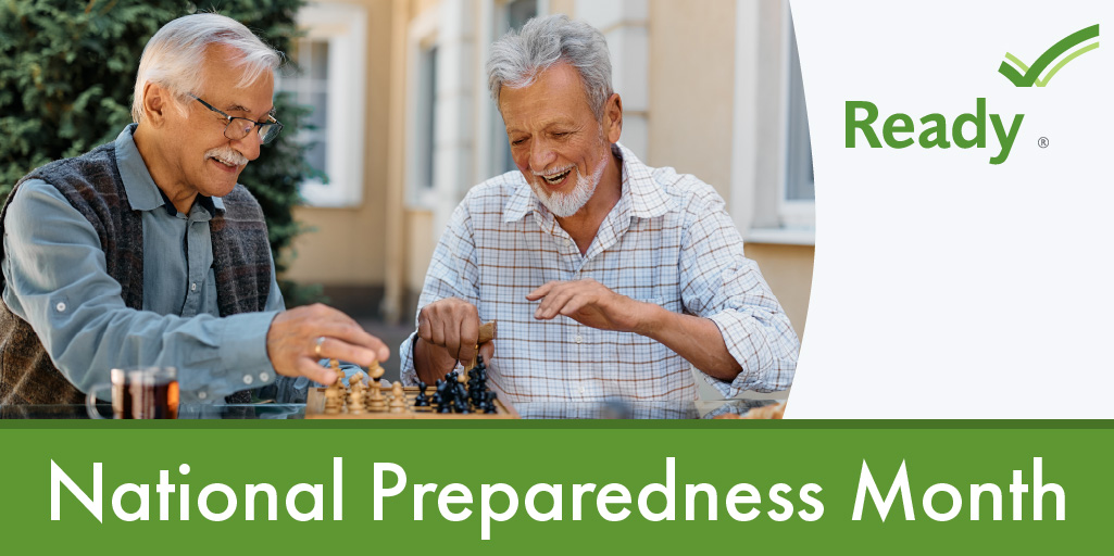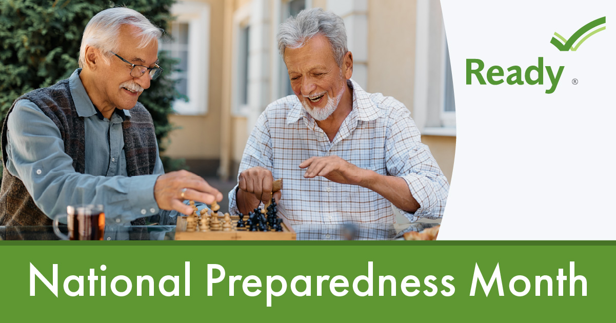 Two older men play chess. National Preparedness Month.