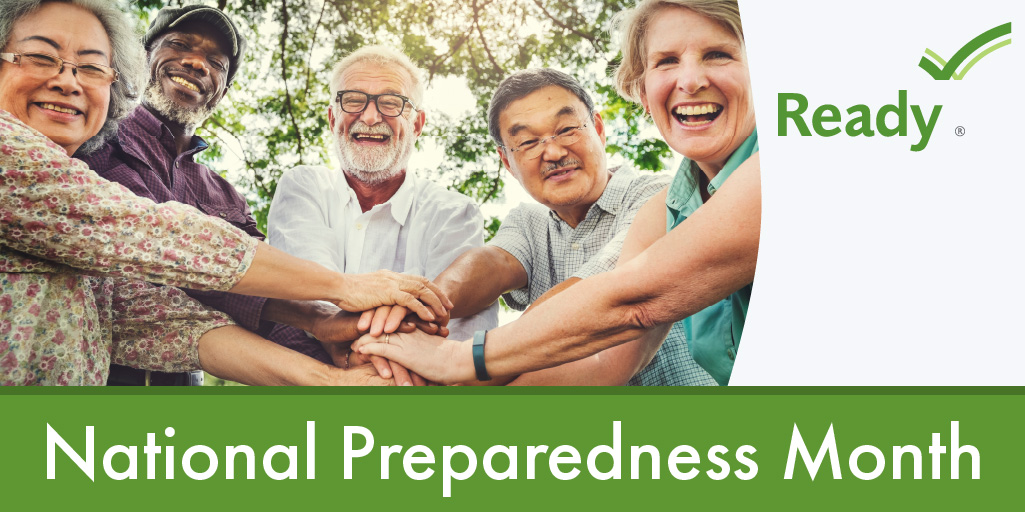 A group of older adults smiles with their hands together. National Preparedness Month.