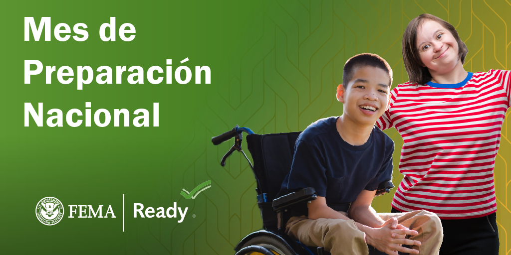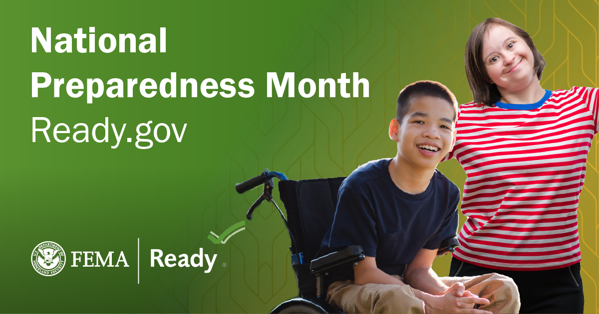 Picture of a boy in a wheelchair and a girl with down syndrome. National Preparedness Month.