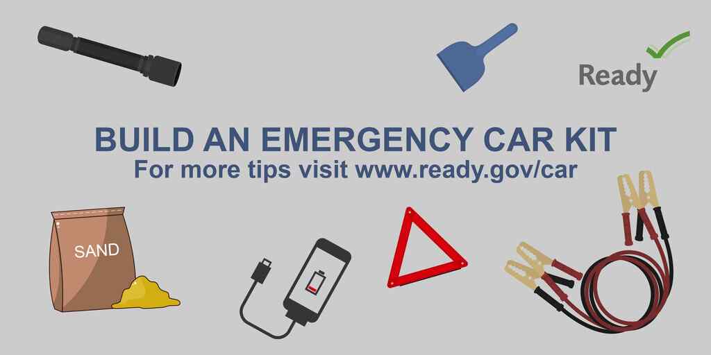 Emergency car kit supplies including flashlight, scraper, sand, phone charger, jumper cables and reflective signs. Build an emergency car kit. for more tips visit www.ready.gov/car